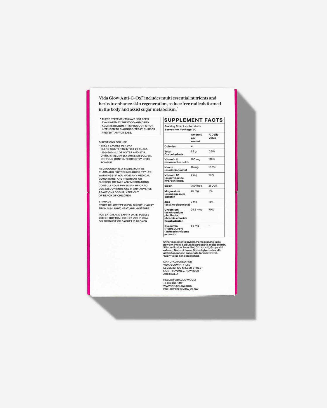 As part of your daily beauty routine, Anti-G-Ox is an extra line of defence for skin against premature ageing. Anti-G-Ox Berry is a daily antioxidant supplement that defends at a cellular level against three root causes of premature ageing. Inflammation, advanced glycation end products (AGEs) and oxidative stress. With a potent blend of actives, the formula enhances skin health, assists healthy sugar metabolism and reduces free radical damage caused by modern life.