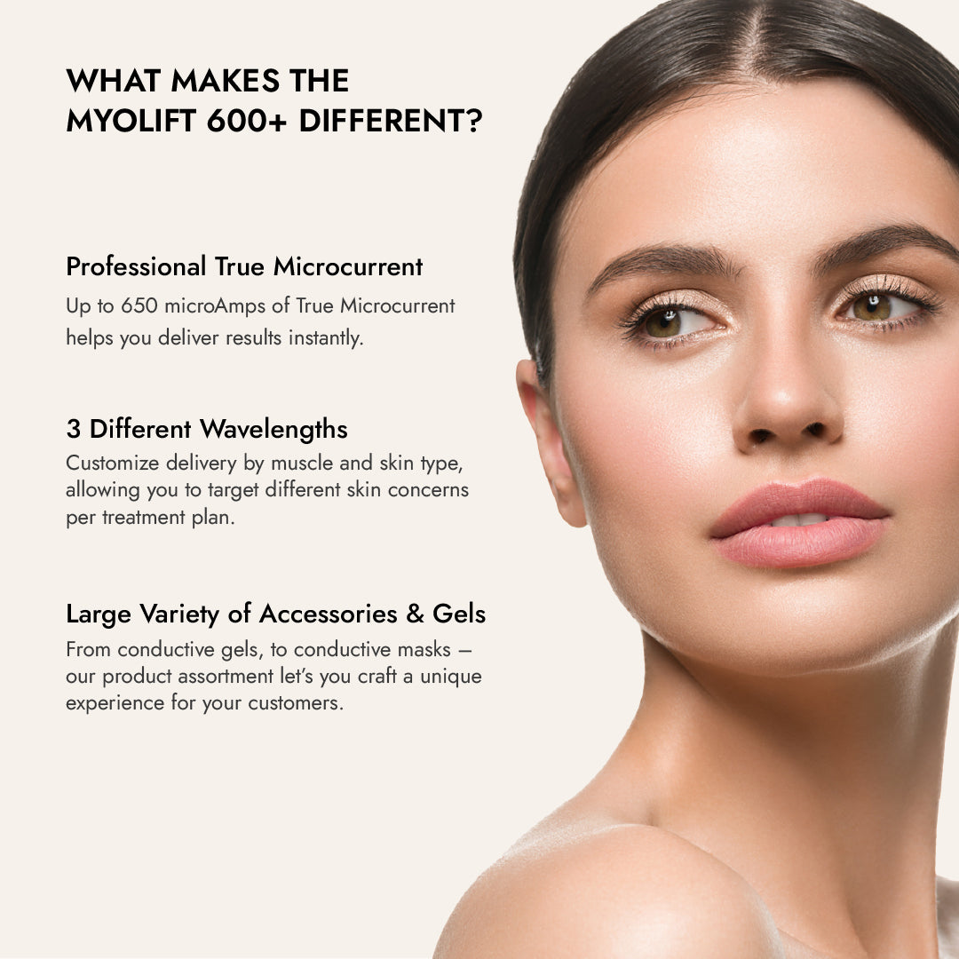 What's Included: MyoLift™ 600 Device, 4oz Renu Gel, 4oz Restore Gel, 8oz Replenish Spritzer, ATP Booster Mask, 4 Lip Masks, 4 Forehead Masks, 4 Eye Masks, Lead Wire, Charger, Applicator Probes7E, Headband, Silicone Brush.