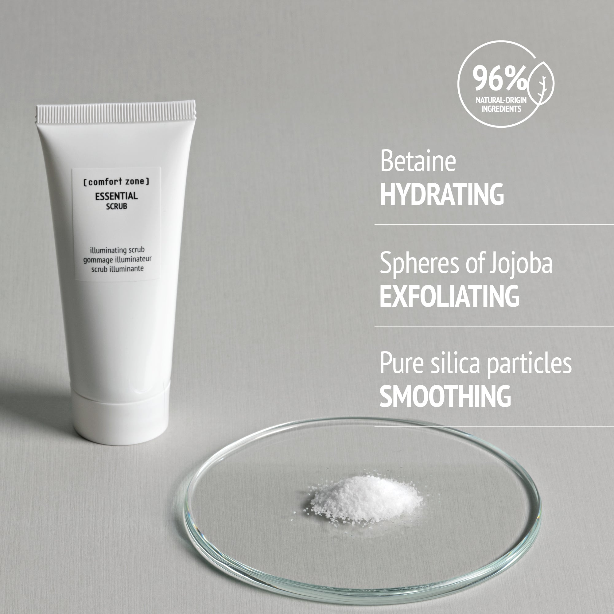 To allow the skin to better absorb the products in your skincare routine, it is essential to exfoliate from time to time. Essential Scrub is a mechanical exfoliant with a creamy texture, enriched with two-dimensional particles that provide even exfoliation, suitable for all skin types, in particular for thick, impure and combination skin.