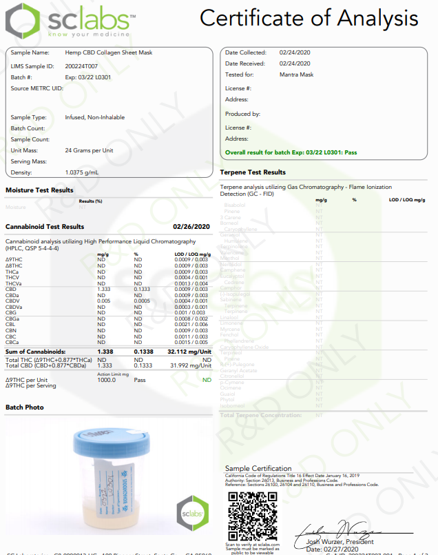 Promote collagen regeneration with a powerful blend of over 22 amino peptides, including CBD and hyaluronic acid. These ingredients have been known to rebuild collagen, reduce inflammation and the appearance of fine lines and wrinkles, the CBD Collagen Mask will unleash your most radiant and youthful glow.