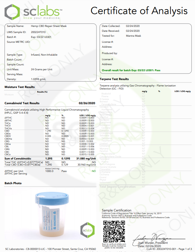 Increase our body’s natural ability to replenish new skin cells with the CBD REPAIR Mask!Vitamins B3, B5, C, and E rejuvenate skin cells, Chamomile, Calendula, and Beta Glucan calm and soothe while all-natural CBD repairs dull or damaged skin. Revive, nourish and heal with the CBD REPAIR Mask.